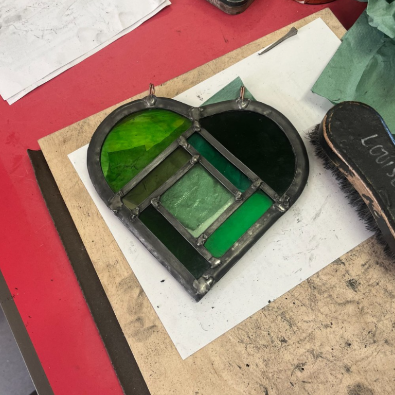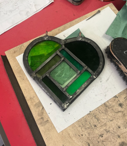 The craft of stained glass and lead light window making using traditional techniques. Design a simple line drawing. From this, the glass pieces are cut and assembled on top of the drawing, bending and cutting the lead to fit around the glass. The joints of the lead sections are soldered to finish.